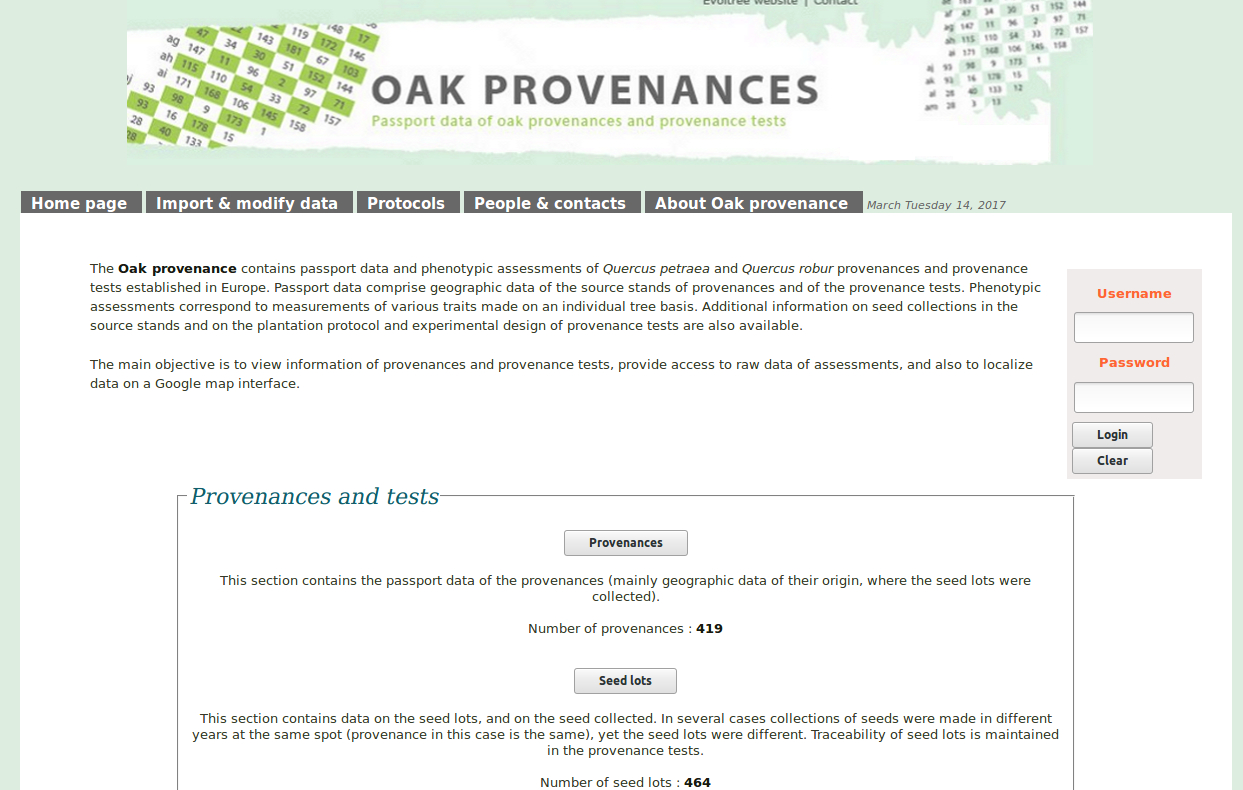 Quercus Portal is plugged on the Evoltree eLab (electronic Lab) cache system developed by Dieter Kopecky and Johanna Schmidt from the Austrian Institute of Technology GmbH. It was constructed within Evoltree (http://www.evoltree.eu/) a large EU-funded Network of Excellence, by members of BIOGECO (Audrey Jacques-Gustave, Antoine Kremer, Thierry Labbé, Melina Millox, Christophe Plomion, Frédéric Raspail, Jean-Paul Soularue, François Ehrenmann).