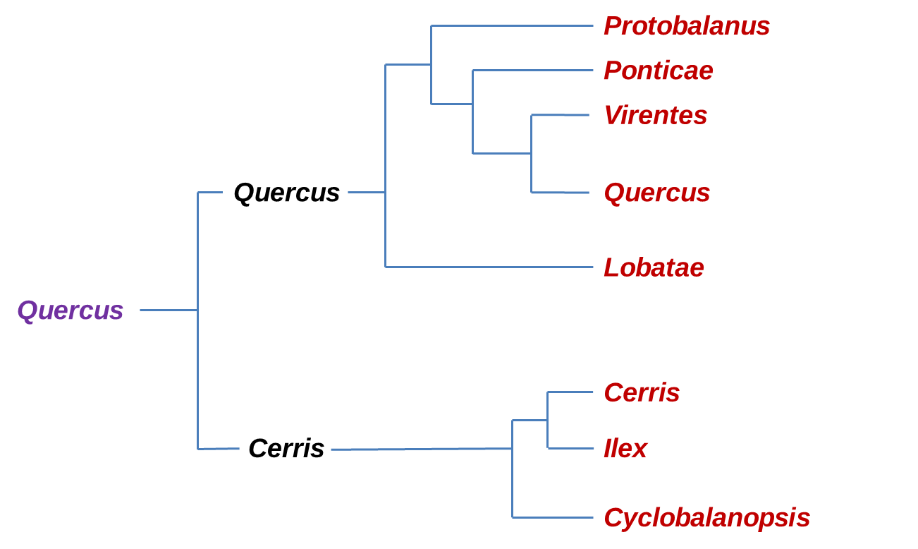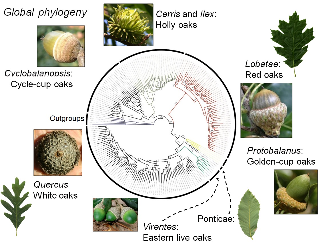 Recent molecular phylogenetic studies (Denk & Grimm, 2010; Hipp et al. 2014, 2015, 2017, 2018; Hubert et al., 2014; Manos et al., 2001; McVay et al. 2017; Oh & Manos, 2008) consistently suggest two major clades within oaks, one comprising three Old World groups (sections Cyclobalanopsis, Ilex, and Cerris), the other comprising three New World groups (sections Protobalanus, Virentes, and Lobatae,) and two northern hemispheric groups (sections Ponticae and Quercus).