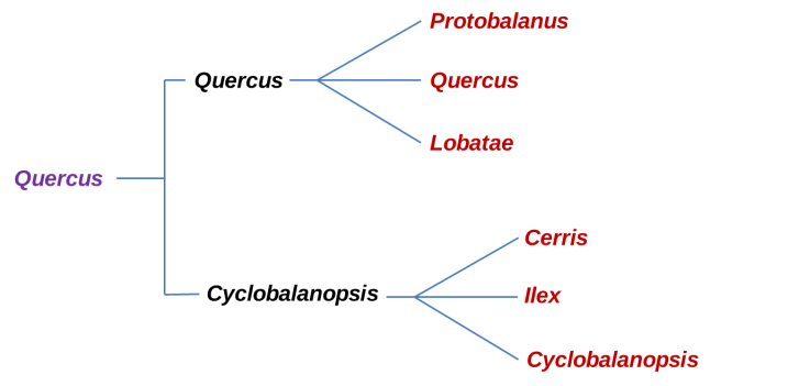 Phylogeny of the major clades of Oaks before RADseq analysis. In Violet is the Quercus genus, Black is the Sub-genus and in Red the Sections.